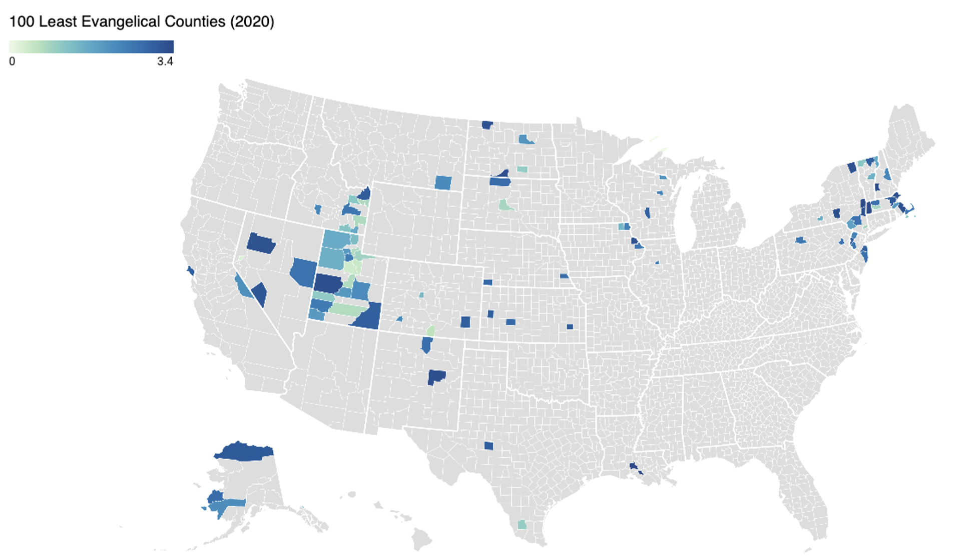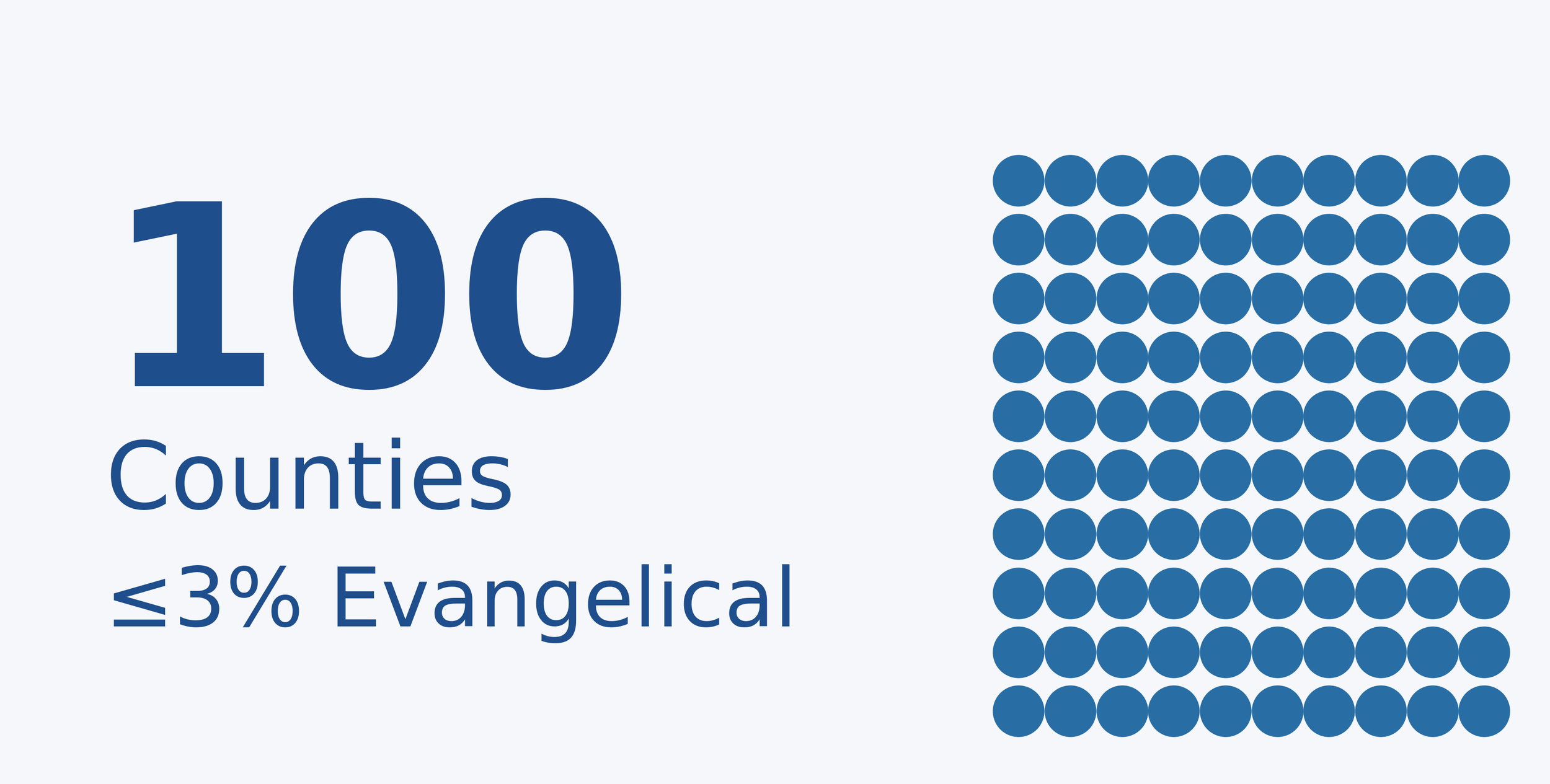 In addition to the least-reached metro areas, we wanted to know the locations of the least-reached US counties. While the metros were filtered with a ≤5% statistic, the counties were limited to those of ≤3% evangelical. One hundred counties may be identified by this metric.