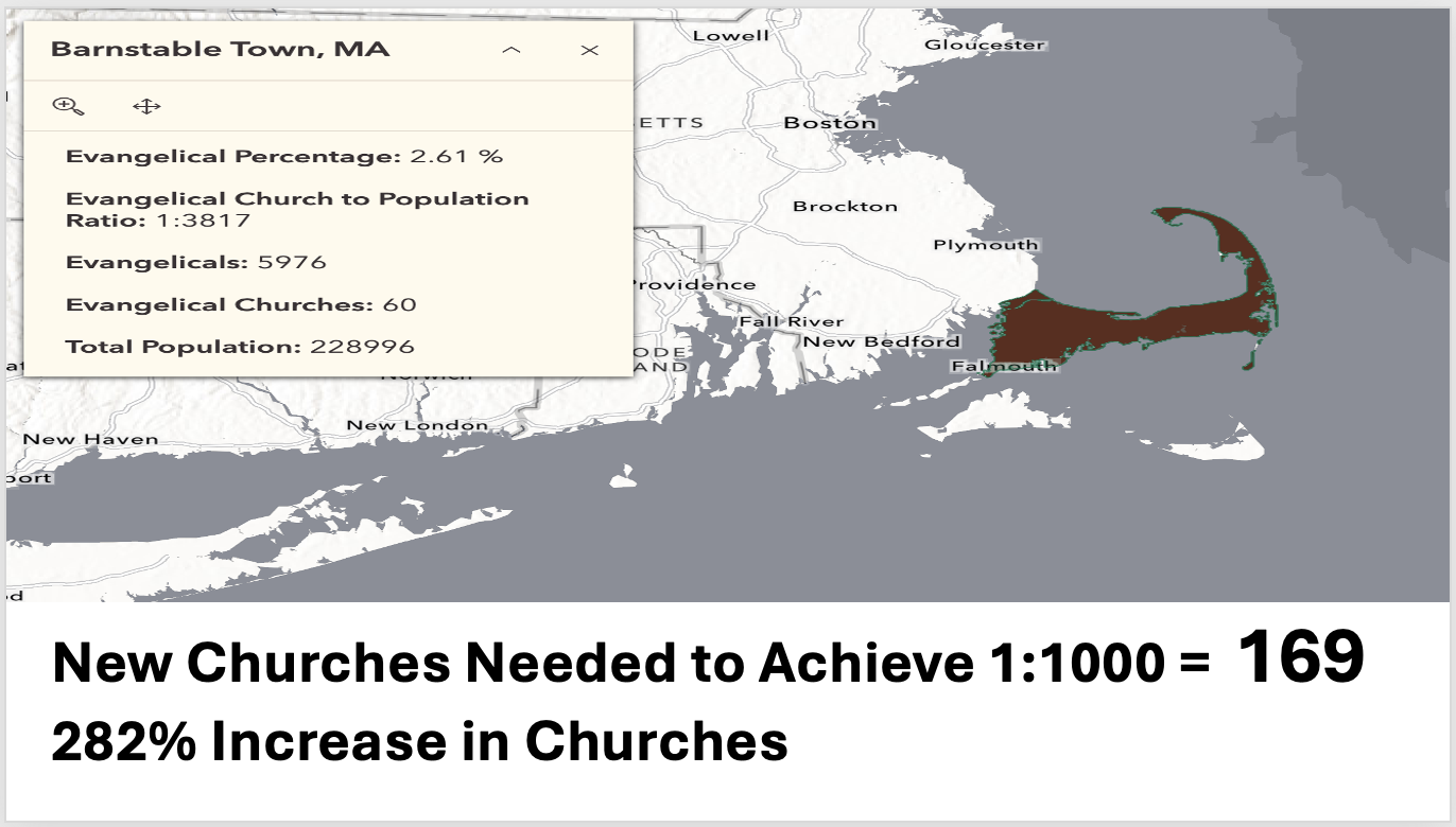 Barnstable Town has 229,000 people with an evangelical percentage of 2.6%. Though there are 60 evangelical churches in the area comprised of 6000 members, its evangelical church to population ratio is 1:3817. To reach the ideal metro ratio (1:1000), 169 new churches are needed.