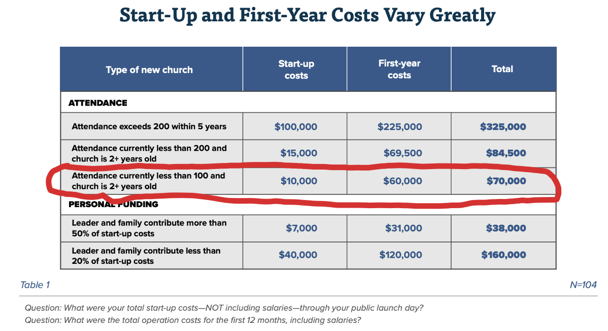 Warren Bird attempted to answer this question. Assuming the present ubiquitous church planting model in the US (plant and pastor), Bird’s article, “Funding: What Does it Cost to Launch a New Church or Campus?” (ECFA Study 2022, pg. 2), noted the most conservative estimate is $70,000.