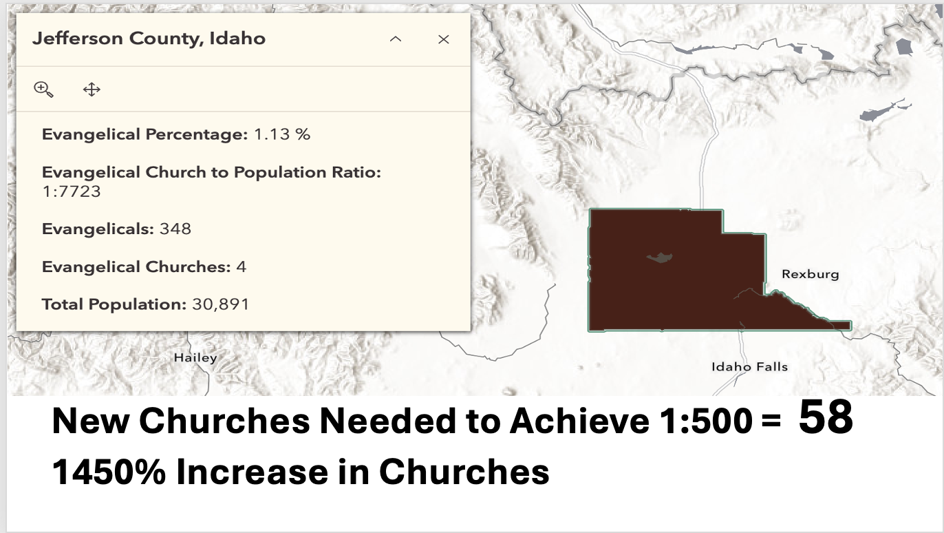 Consider two US locations, Jefferson County, Idaho and Barnstable Town, MA (I randomly selected these from the evangelical study recently released.). At 1.1% evangelical, Jefferson County has a population of 31,000 and 4 evangelical churches. Its present evangelical church to population ratio is 1:7723. To reach the ideal rural ratio (1:500), 58 new churches are needed.