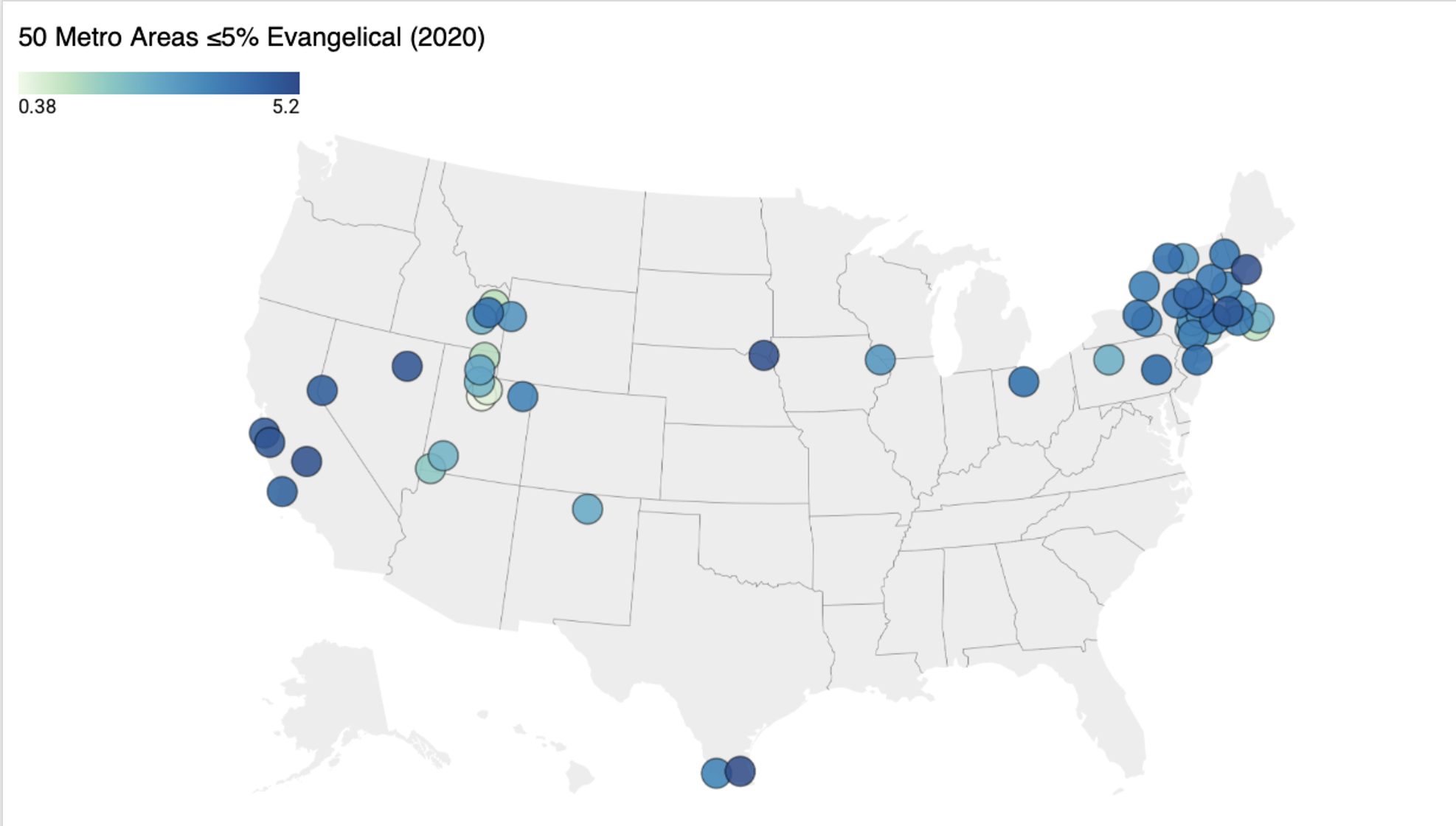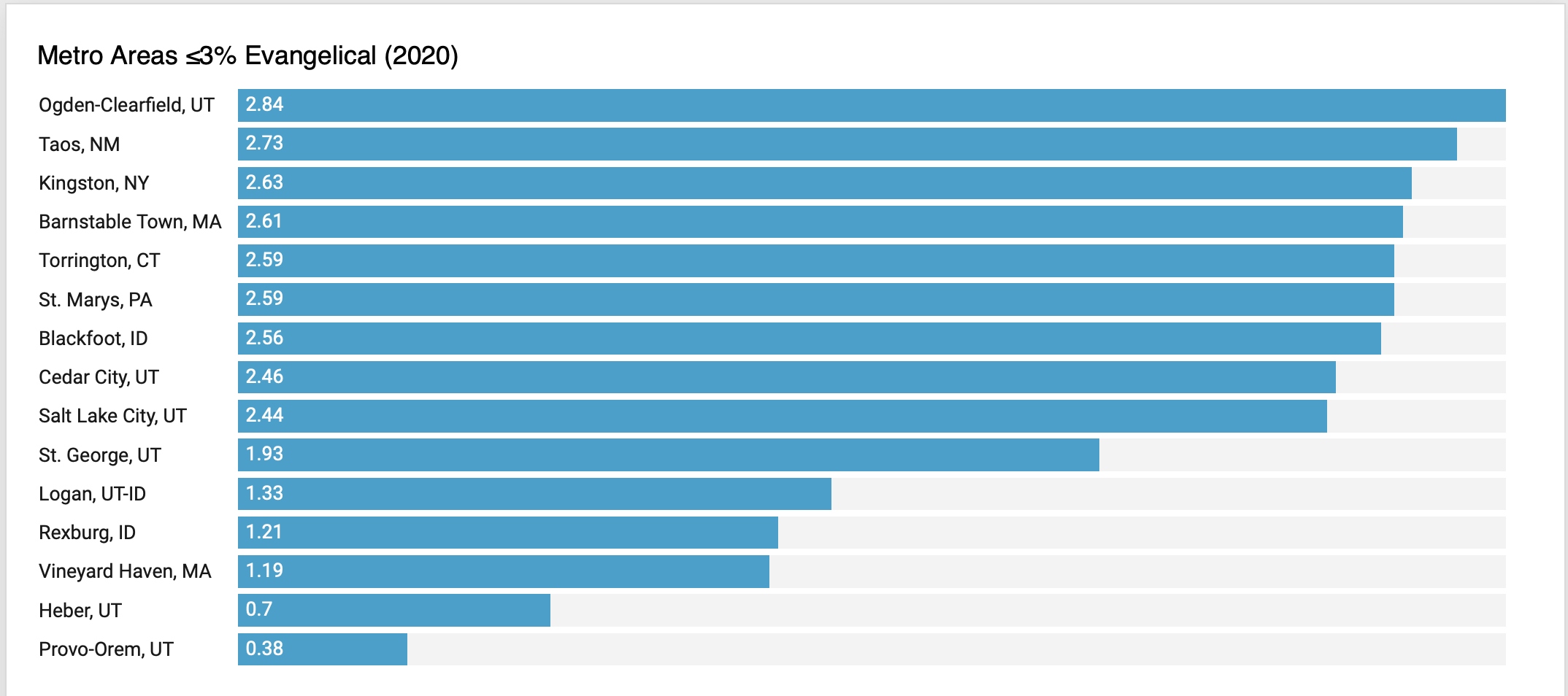 We also wanted to know what areas were less-than or equal to 3% evangelical. Among the fifteen, seven are located in Utah, two each in Idaho and Massachusetts, one each in New Mexico, Pennsylvania, New York, and Connecticut.