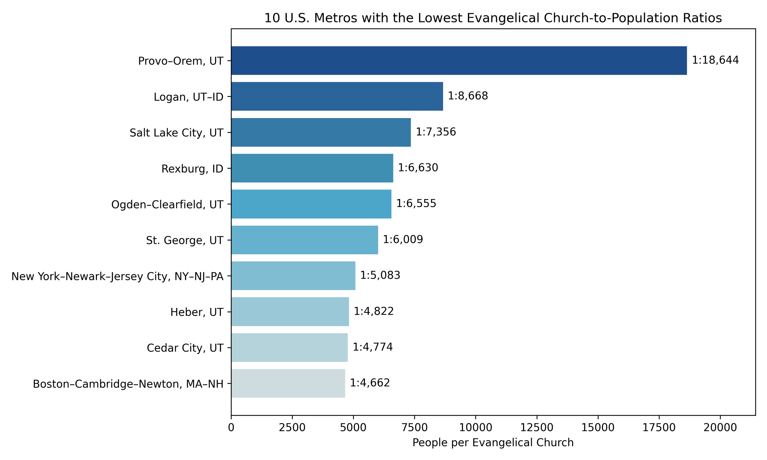 The ten locations with the lowest evangelical church-to-population ratios are located in Utah, Idaho, and the greater Boston and New York communities. Again, Provo-Orem, with 1:19,000, is an outlier, with the other cities ranging from one church to every 4700-8700 people.